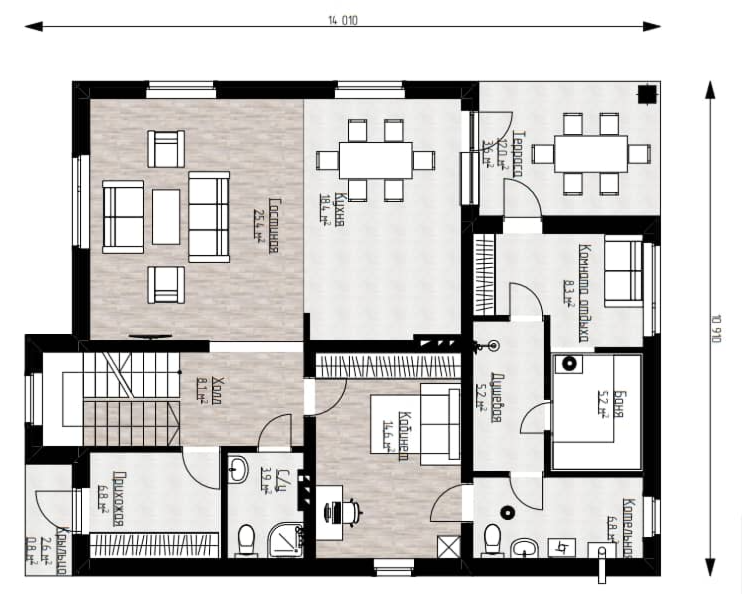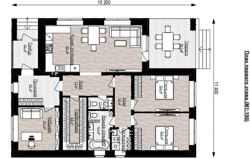 - Площадь террас: 12 м2, баня внутри 5,2 м2